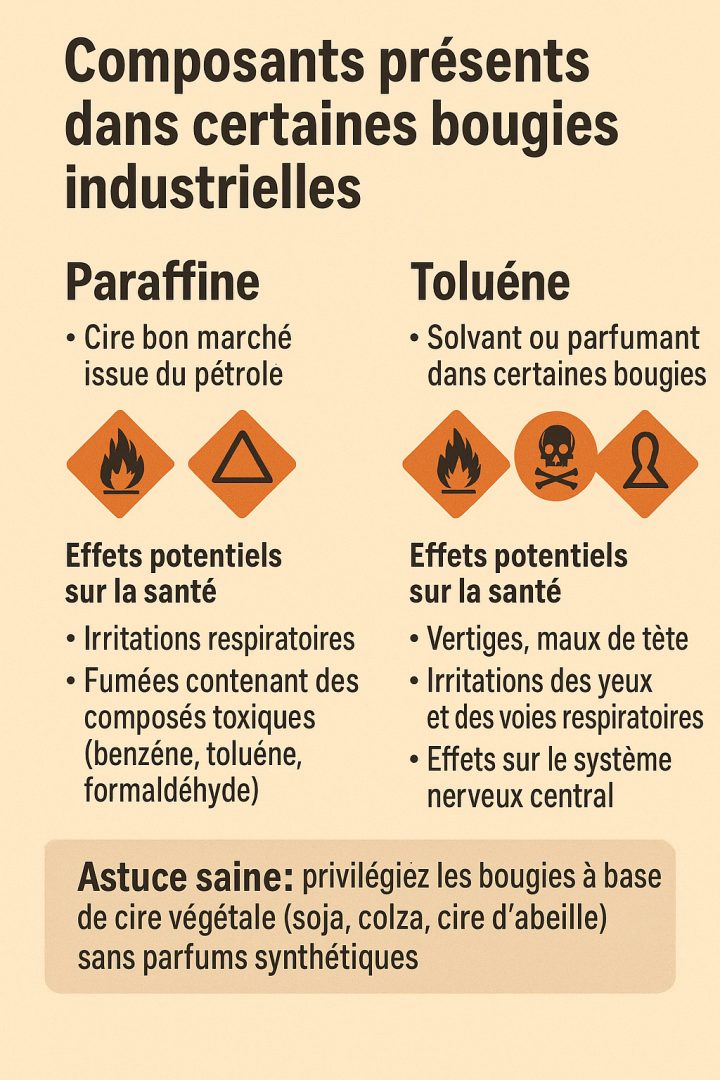 - Cire de paraffine, dérivée du pétrole, qui dégage des substances toxiques à la combustion.