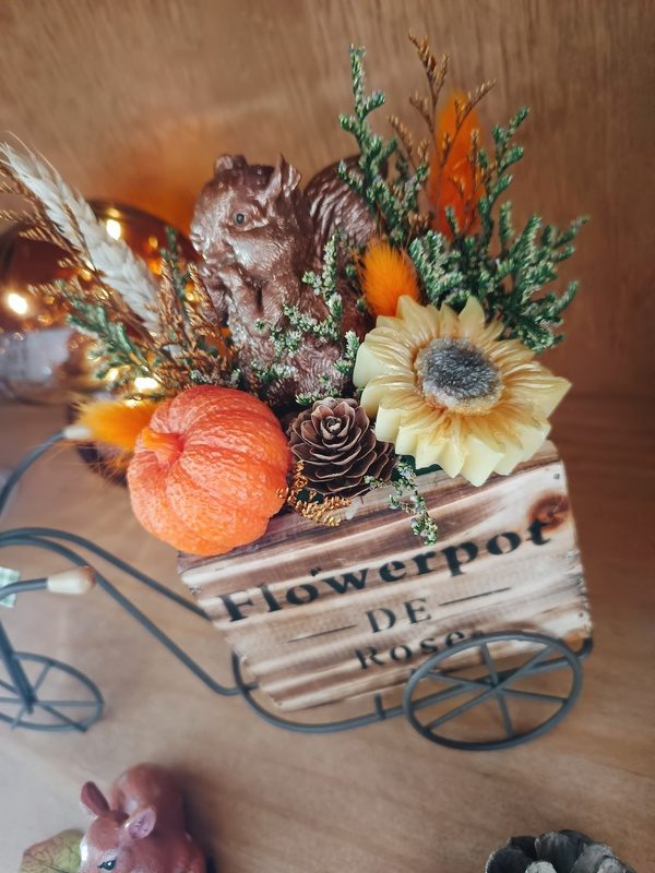 Fleurs séchées et décorations automnales (mini citrouille, pomme de pin, tournesol en cire, écureuil parfumé)