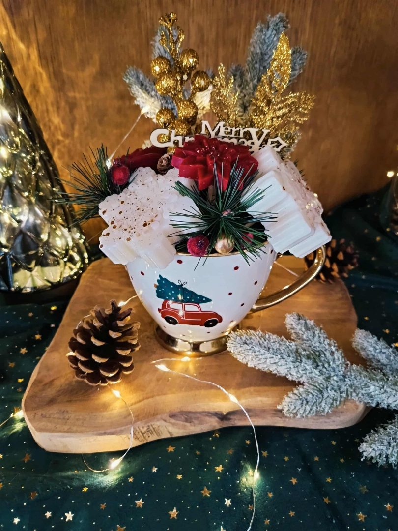 Fondants parfumés artisanaux aux senteurs “Fleur de Noël” et “Sapin de Noël”, présentés dans une adorable tasse décorative de Noël. Un cadeau parfumé et festif à offrir ou à s’offrir !