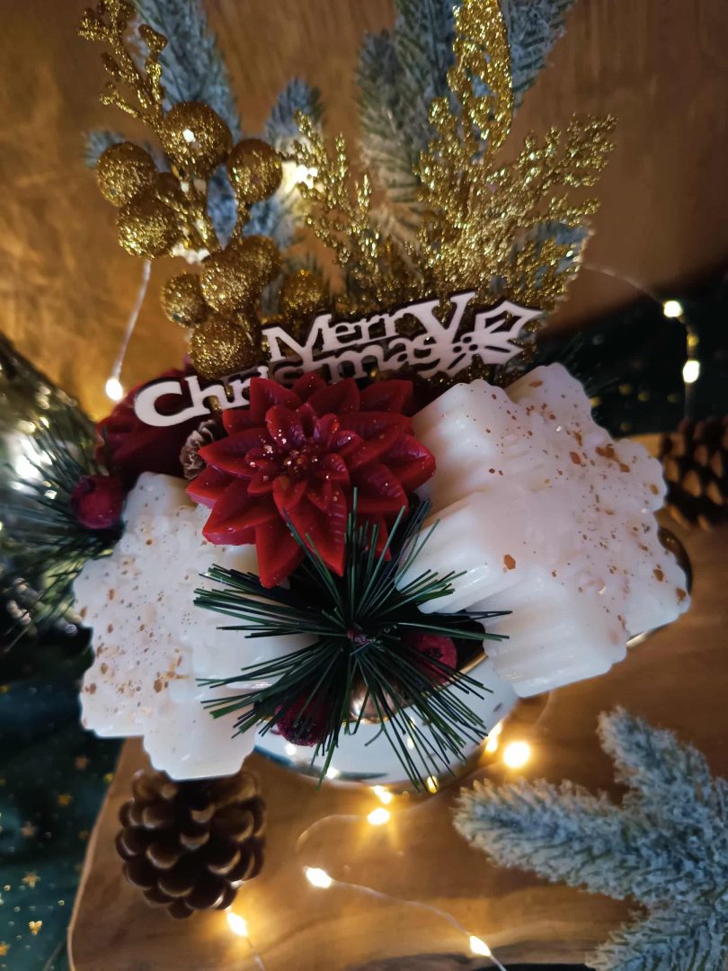 Composition : fleurs artificielles, fondants parfumés, décorations de Noël