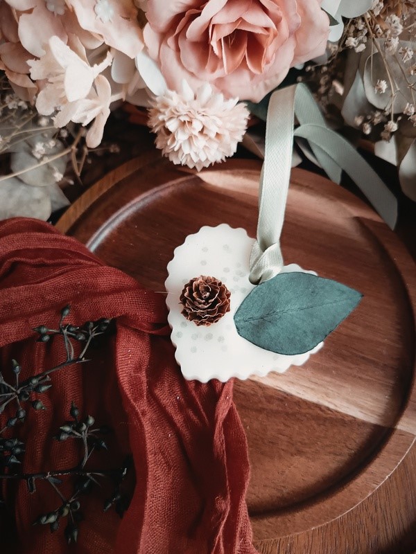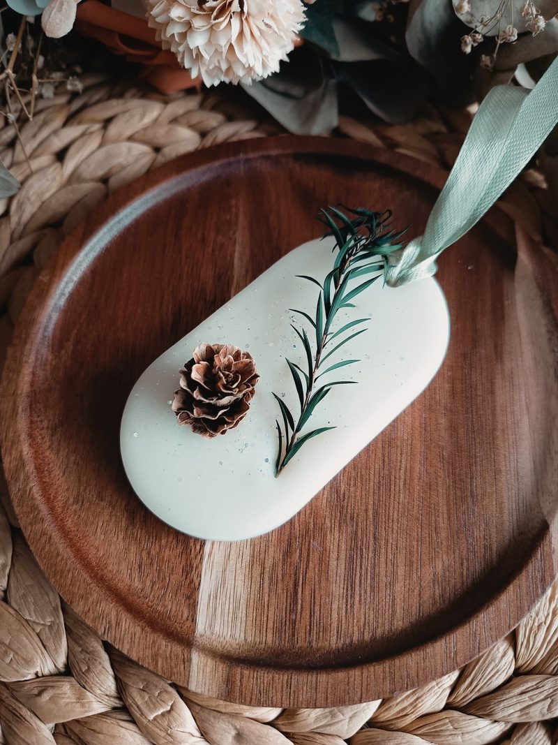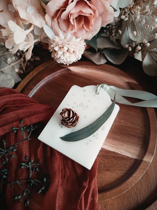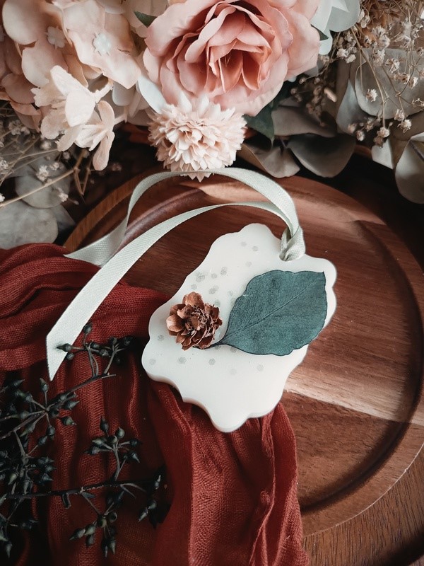 Chaque pièce est ornée de fleurs séchées aux nuances vertes et d'une mini pomme de pin, pour une touche naturelle et élégante.