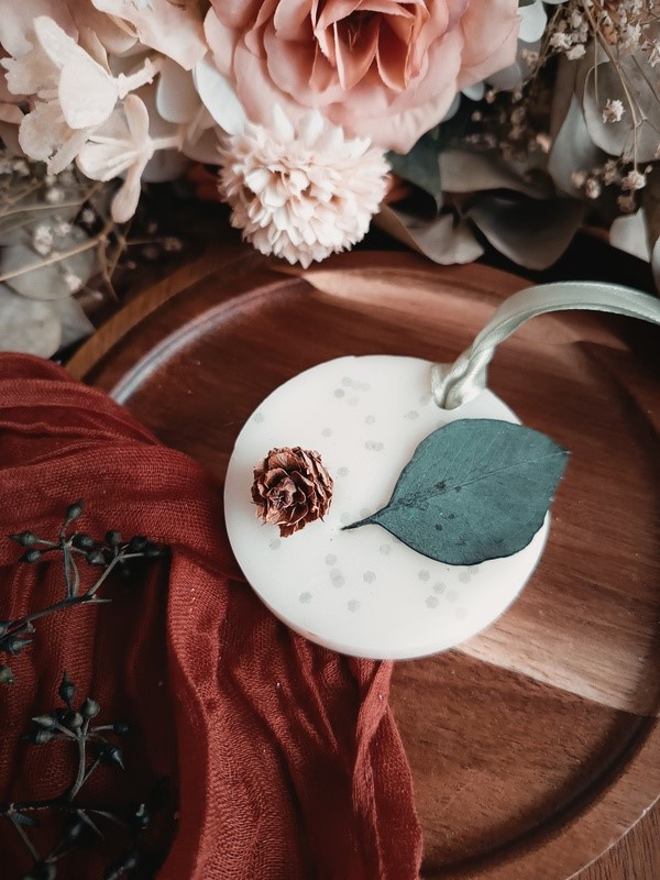 - Une fois que le parfum à froid n'est plus assez prononcé, vous pouvez utiliser votre suspension en fondant parfumé à faire fondre dans un brûle-parfum et bougie chauffe-plat ! (N'oubliez pas de retirer les fleurs et les mini pommes de pin afin d’éviter tout risque d’incendie.) Comme cela, vous réveillerez le parfum à chaud, ou simplement la conserver comme élément décoratif.