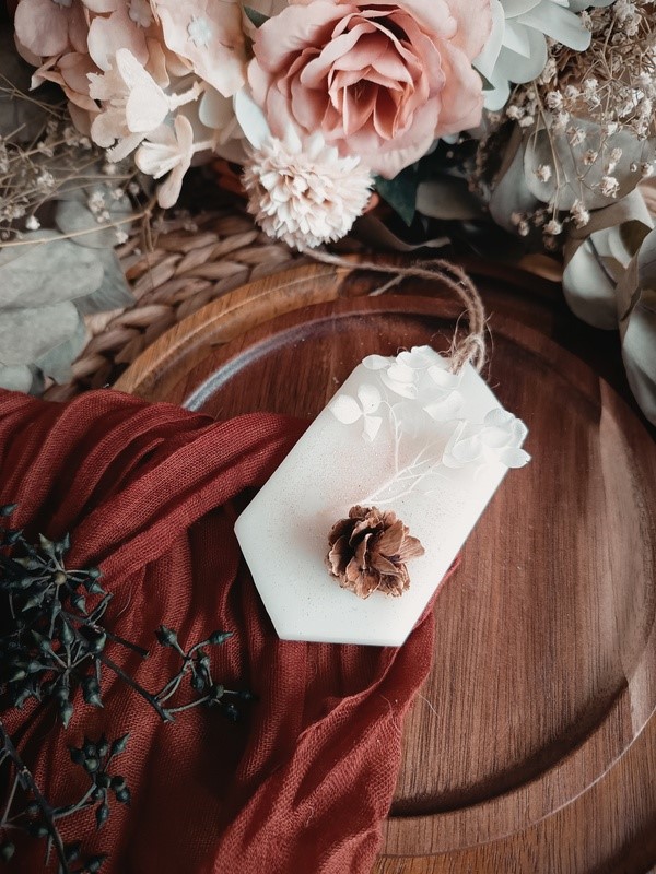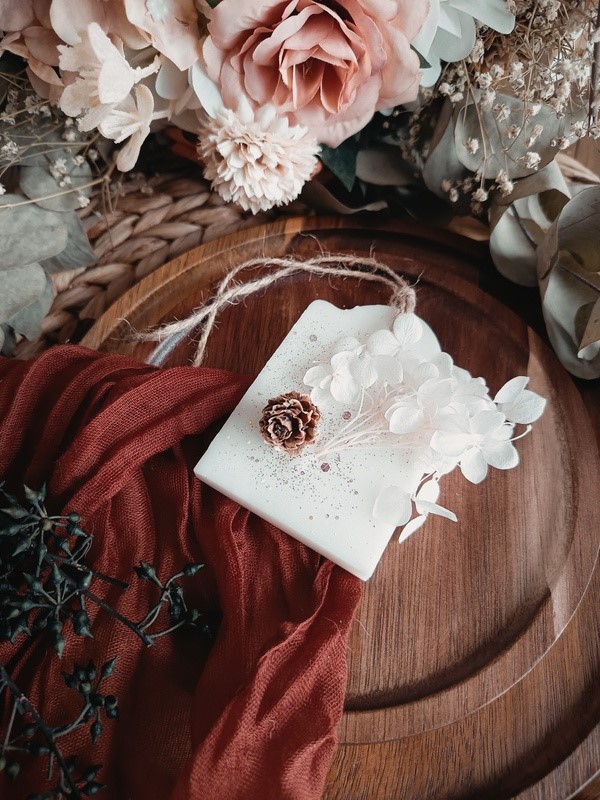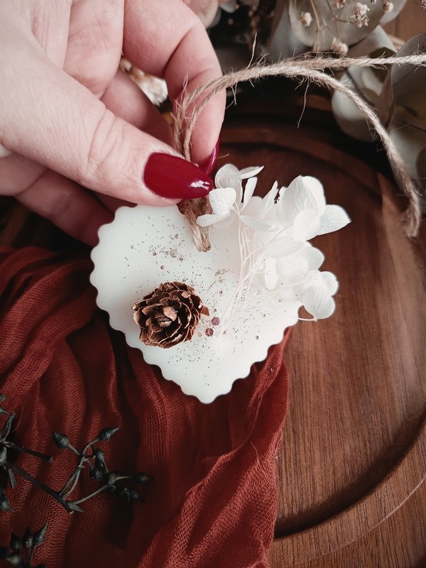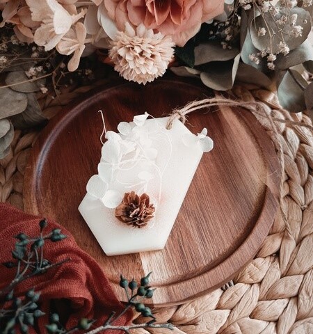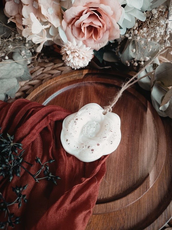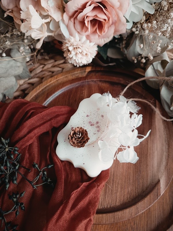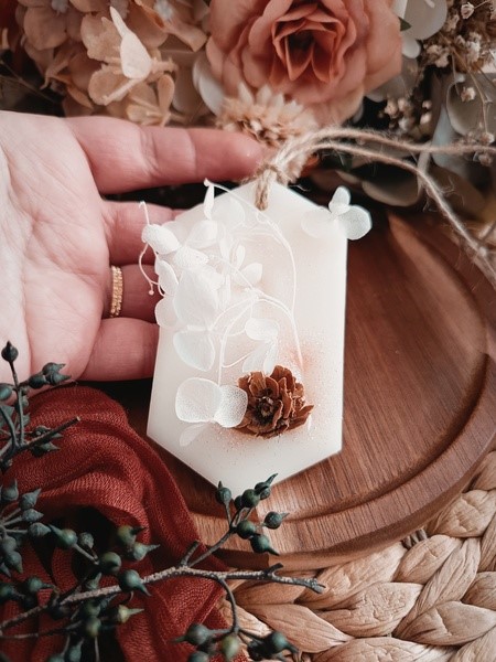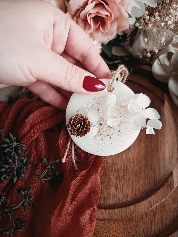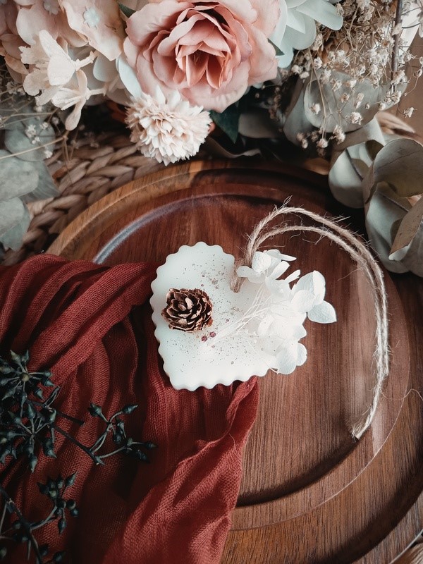 - Une fois que le parfum à froid n'est plus assez prononcé, vous pouvez utiliser votre suspension en fondant parfumé à faire fondre dans un brûle-parfum et bougie chauffe-plat ! (N'oubliez pas de retirer les fleurs et les mini pommes de pin afin d’éviter tout risque d’incendie.) Comme cela, vous réveillerez le parfum à chaud, ou simplement la conserver comme élément décoratif.