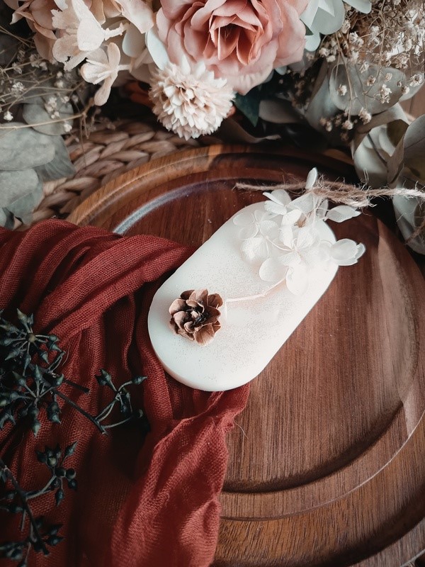 Apportez une note de raffinement et de bien-être à vos espaces avec notre suspension dressing Musc blanc parfumée. Confectionnée à la main en cire végétale sans OGM, elle est sublimée par des fleurs stabilisées dans les teintes blanches et d’une mini pomme de pin, pour une touche naturelle et élégante.